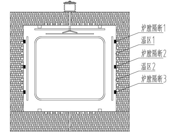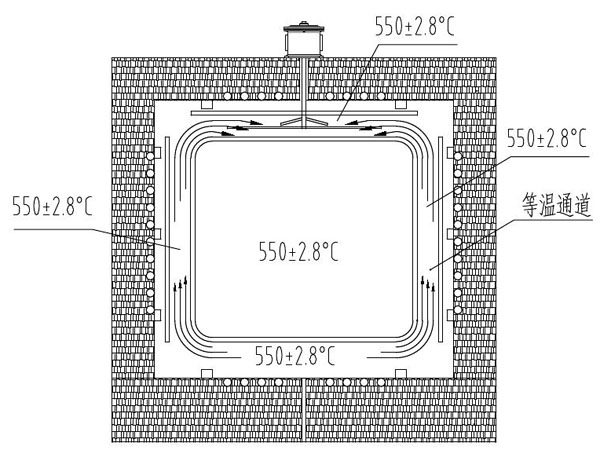 等溫熱風循環系統把等溫熱風通道內的等溫熱風從爐膛的頂部吹入爐膛,爐內的熱風從爐底的等溫熱風通道循環進入爐膛兩側的等溫熱風通道,形成等溫熱風循環,是實現溫度均勻性≦±5℃的可靠保證。